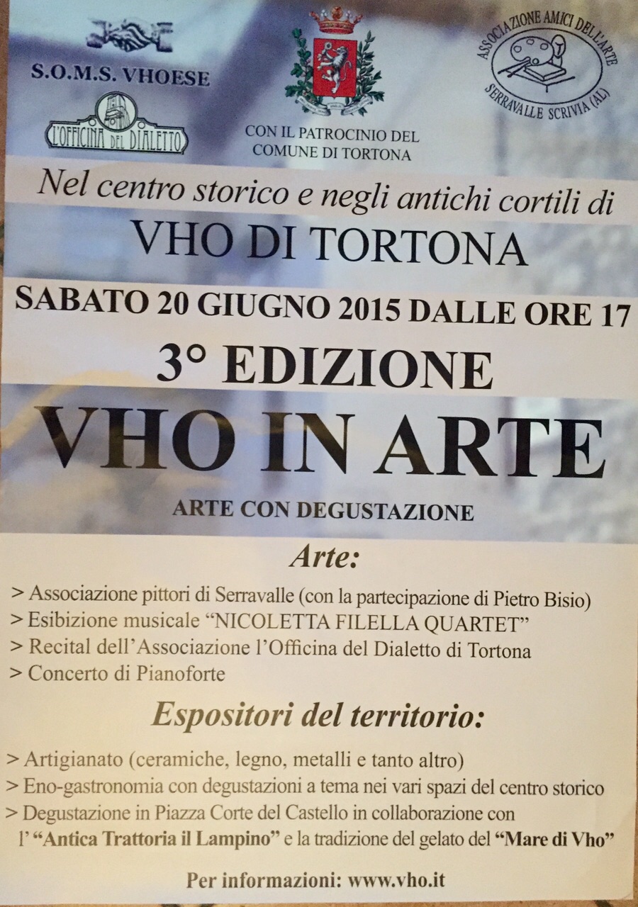 Sabato 20 giugno dalle ore 17:00, nel centro storico e negli antichi cortili di Vho, apre Vho in Arte. A comporre il programma di questa III edizione, oltre alla tradizionale presenza della pittura, con la partecipazione di Pietro Bisio e dell’Associazione pittori di Serravalle,  saranno la musica del Nicoletta Filella Quartet ed il recital dell’Officina del Dialetto di Tortona. Gli spazi dedicati alle degustazioni enogastronomiche e all’artigianato locale avranno il compito di rendere il tutto ancor più intrigante. E se alla fine vi mancasse giusto quel qualcosa che serve per chiudere la serata in bellezza … cosa ne direste di riprendere la tradizione del gelato del Mare di Vho con sottofondo di pianoforte?