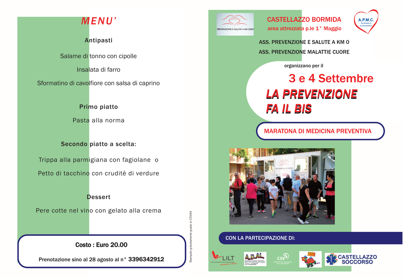 Castellazzo Bormida – La prevenzione fa il bis Posted on 3 agosto 2016 by SOMS Insieme Riceviamo dalla Fondazione Mutuo Soccorso la segnalazione di questa importante manifestazione che si terrà a Castellazzo Bormida i primi di settembre: prevenzione, sport … e anche il menù sembra di tutto rispetto. A quanto pare non ci sono scuse! Condividi: Fai clic per inviare un link a un amico via e-mail (Si apre in una nuova finestra) E-mail Fai clic per condividere su X (Si apre in una nuova finestra) X Fai clic per condividere su Facebook (Si apre in una nuova finestra) Facebook Fai clic qui per condividere su LinkedIn (Si apre in una nuova finestra) LinkedIn Fai clic per condividere su WhatsApp (Si apre in una nuova finestra) WhatsApp Mi piace Caricamento...