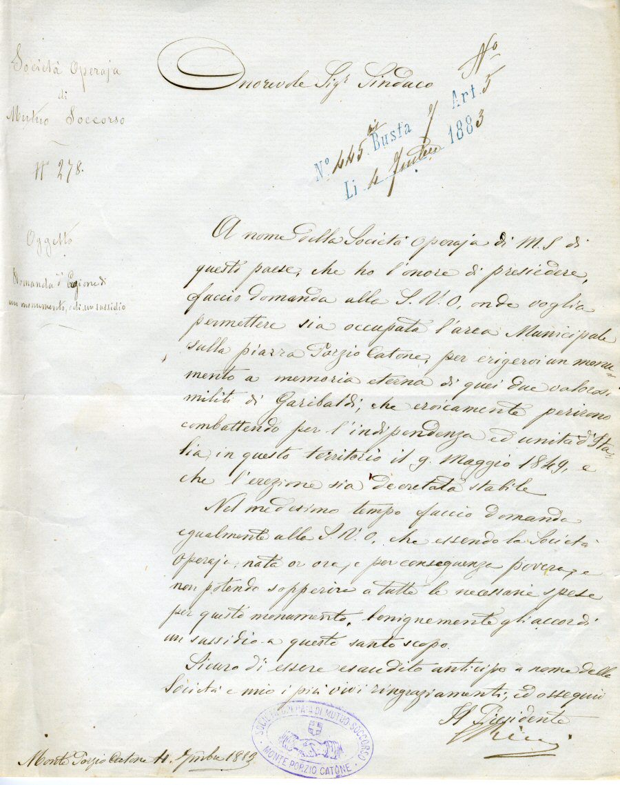 societa-operaia-mutuo-soccorso-04-09-18831883 – Lettera del Presidente della Società Operaia di Mutuo Soccorso di Monte Porzio Catone per richiedere al Sindaco l’autorizzazione ad erigere un monumento a ricordo del sacrificio di due volontari garibaldini caduti nel 1849.