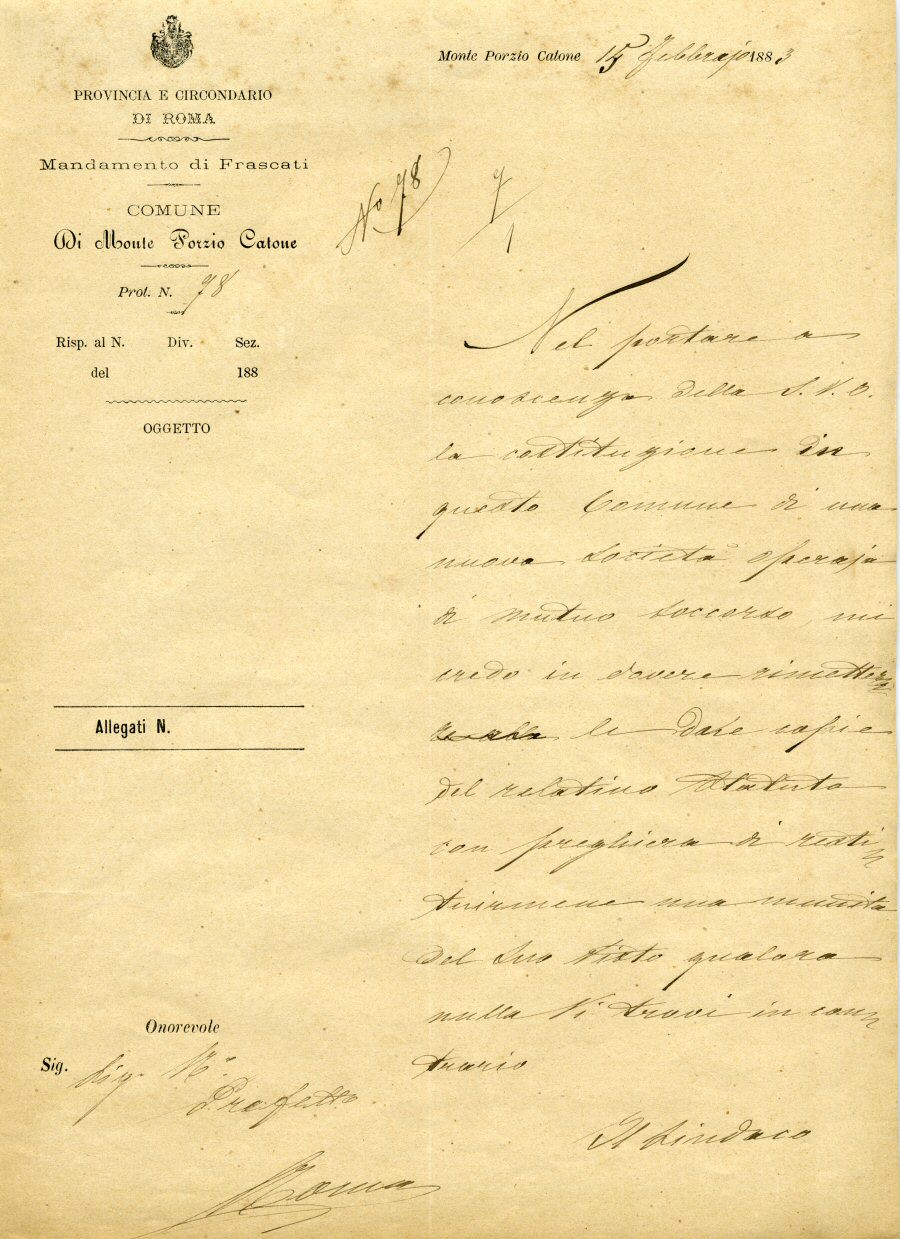 societa-operaia-mutuo-soccorso-15-02-1883-costituzione1883 – Lettera del sindaco di Monte Porzio Catone che comunica al prefetto la costituzione di una nuova Società Operaia di Mutuo Soccorso.