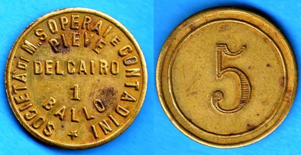 Società di Mutuo Soccorso Operai e Contadini – Pieve del Cairo – gettone per 1 ballo, 5 centesimi