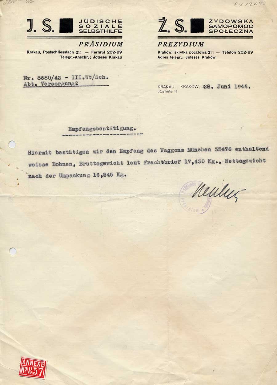 krakow_gd_1_1Documento amministrativo della Judische Soziale Selbsthilfe (Società ebraica di auto soccorso) del ghetto di Cracovia datato 28 giugno, 1942.