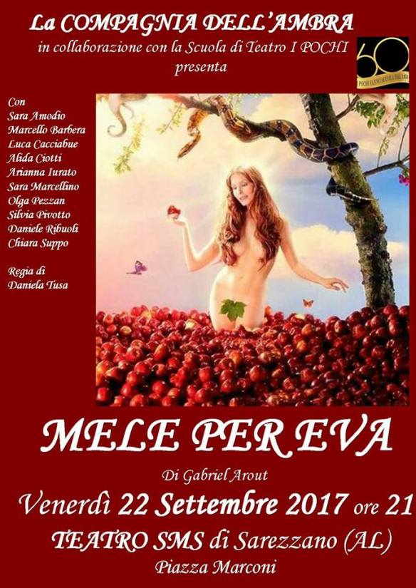 La Compagnia dell’Ambra, con gli attori formati alla Scuola d’Arte Drammatica “I Pochi” di Alessandira diretta da Daniela Tusa, porterà in scena venerdi 22 settembre alle ore 21.00 alla SMS di Sarezzano in piazza Marconi, “ Mele per Eva” una riduzione di “Nove mele per Eva” di Gabriel Arout, al secolo Gabriel Aroutcheff, autore russo ma francese di adozione che compone l’opera adattando e rielaborando per il teatro i racconti umoristici giovanili di Anton Cechov. La versione della Compagnia dell’Ambra è divisa in cinque storie che si sviluppano in un intreccio a puntate. Storie di coppie, dal tono brillante e farsesco che, come si può forse dedurre già dal titolo, affrontano il tema della seduzione e delle diverse sfaccettature dell’essere femminile che dai tempi dell’Eden non ha ancora soddisfatto la voglia di assaporare il frutto proibito. Nella pièce troviamo donne di ogni età, di diversa estrazione sociale e culturale, ma che in comune hanno lo sguardo disincantato verso l’altro, specialmente verso “questo strano animale” che è l’uomo. Nel girotondo dei sentimenti, quando tutti finiranno giù per terra, chi sopravviverà? A chi resterà in mano la mela tanto contesa?