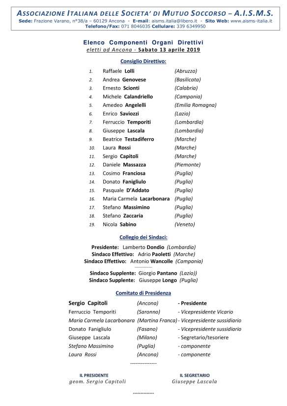 Facendo seguito a quanto deliberato dall’Assemblea dei Soci dell’Associazione Italiana delle Società di Mutuo Soccorso – A.I.S.M.S., tenutasi il 13 aprile 2019 ad Ancona, si comunica che gli Organi Direttivi dell’Associazione eletti sono così composti:
