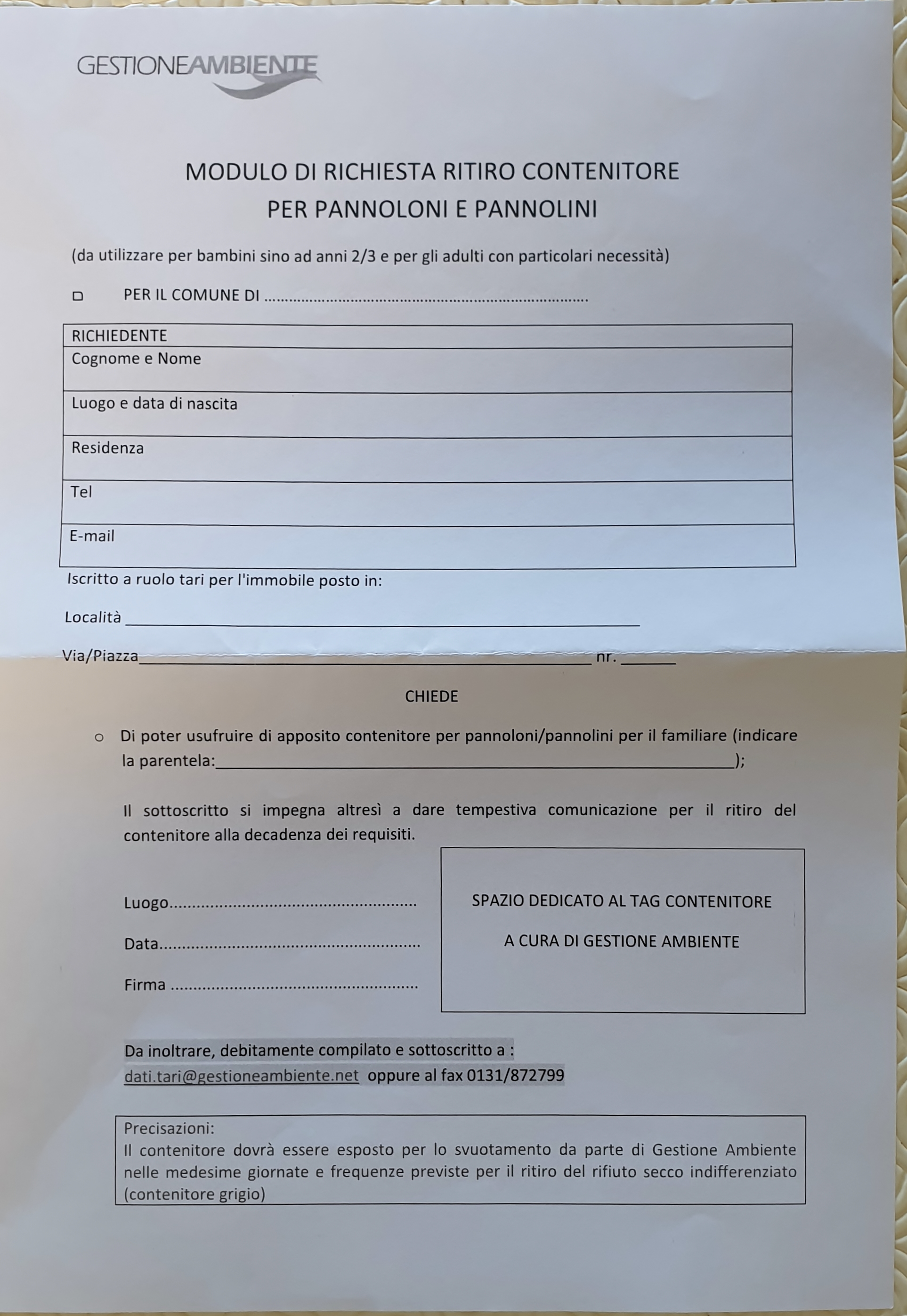 Innanzitutto, la parte riguardante i Comuni. Dopo aver fatto le opportune verifiche, possiamo confermare che i Comuni interessati da noi contattati (es. Carezzano e Carbonara Scrivia) hanno ricevuto i moduli da fornire a tutti gli interessati per richiedere i contenitori per il rifiuto secco sanitario. Nell’immagine qui sotto il modulo inviato da Gestione Ambiente.