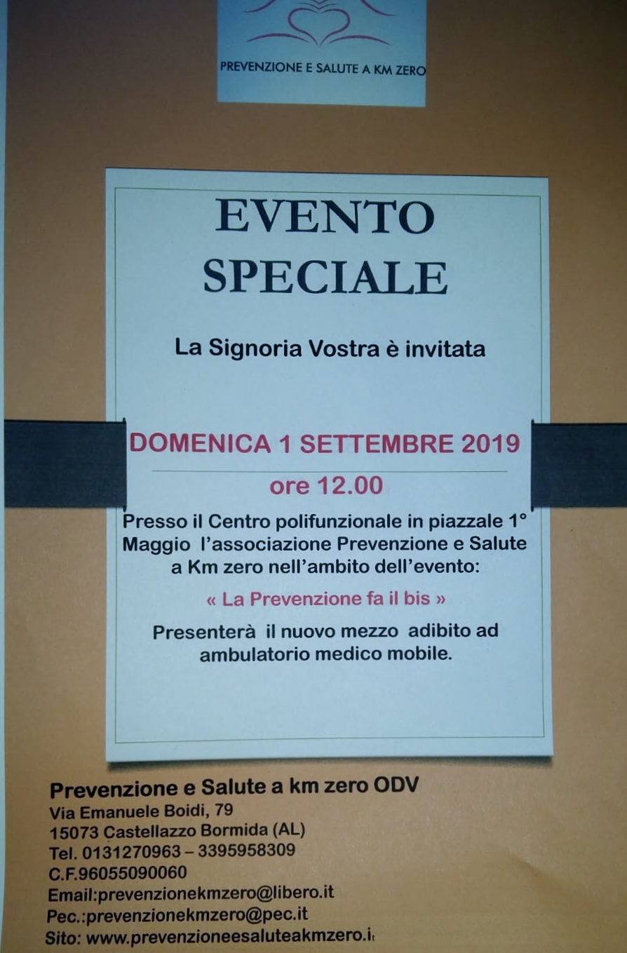 Domenica 1 settembre, presso il Centro Polifunzionale di Castellazzo Bormida in piazzale I maggio, l’Associazione “Prevenzione e Salute a Km zero”, ben conosciuta da tutte le S.O.M.S. del Piemonte per l’impagabile collaborazione fornita, presenterà il nuovo mezzo adibito ad ambulatorio medico mobile.