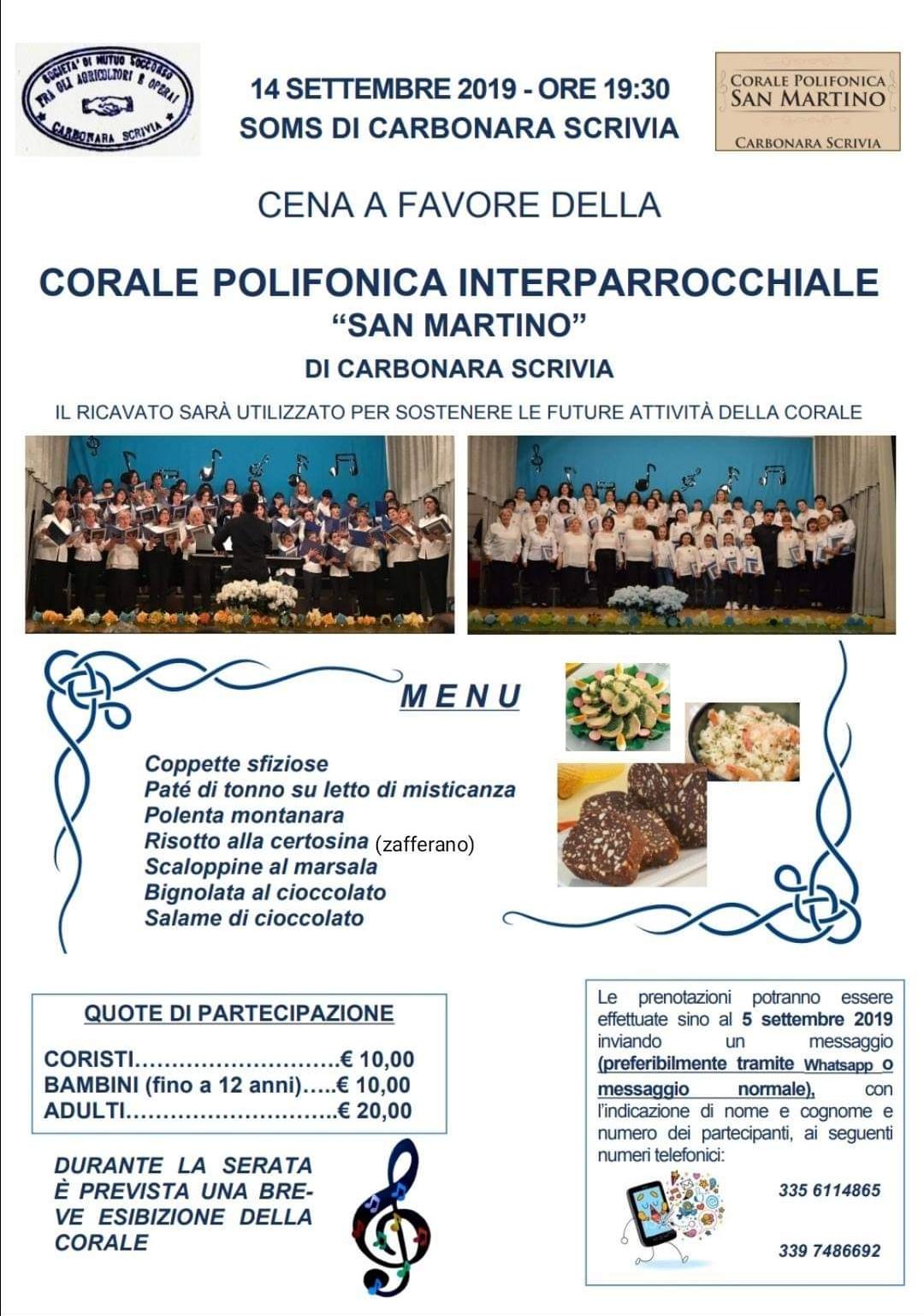 Sabato 14 settembre presso la S.O.M.S. di Carbonara Scrivia, Cena con esibizione a favore della Corale Interparrocchiale “San Martino”. Il ricavato andrà a sostenere le prossime attività della corale.