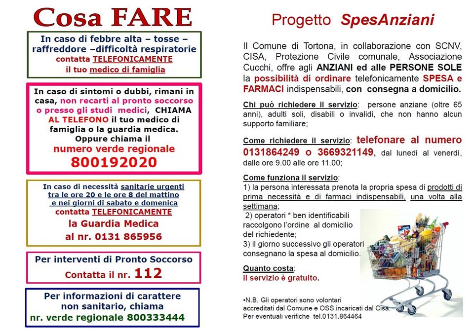 “Il Comune di Tortona, il gruppo comunale di Protezione Civile ed il CISA, su iniziativa dell’Assessorato alla Sicurezza guidato da Luigi Bonetti, hanno avviato una serie di iniziative volte ad offrire consigli e servizi per la prevenzione e la gestione dell’emergenza Covid-19 Coronavirus, in base alle disposizioni del Decreto della Presidenza del Consiglio dei Ministri del 4 marzo scorso.