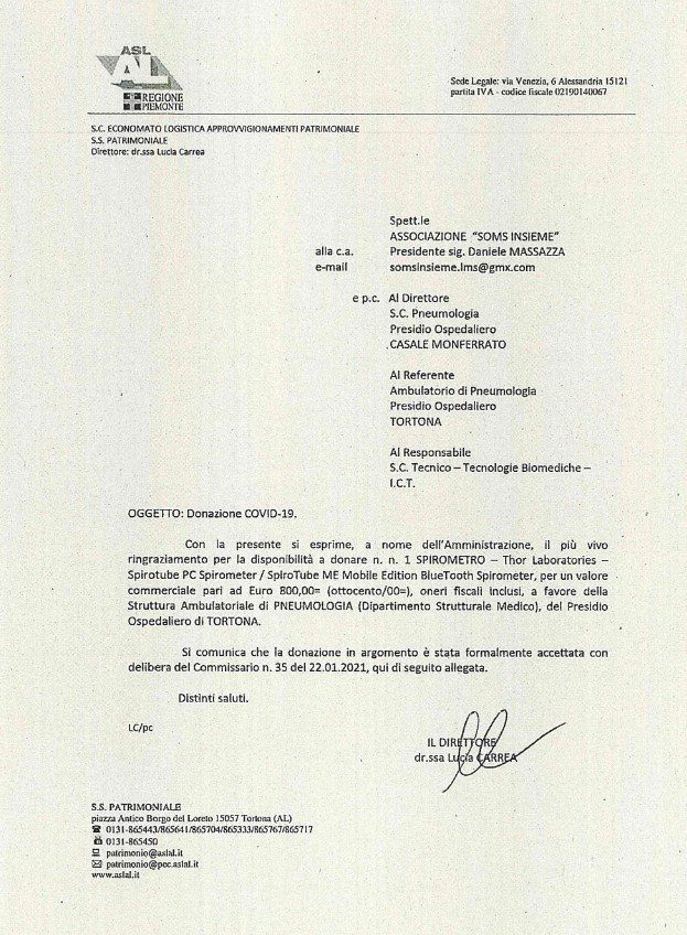 Poi, dopo un certo numero di mail e di moduli compilati per confermare che “l’ASSOCIAZIONE SOMS INSIEME, nella persona del Presidente sig. Massazza Daniele, ha comunicato la disponibilità alla donazione, a puro titolo di liberalità, di n. 1 SPIROMETRO … … da destinare alla STRUTTURA AMBULATORIALE di PNEUMOLOGIA (Dipartimento Strutturale Medico) del Presidio Ospedaliero di TORTONA ...”, agli inizi di febbraio ci è arrivata questa comunicazione.
