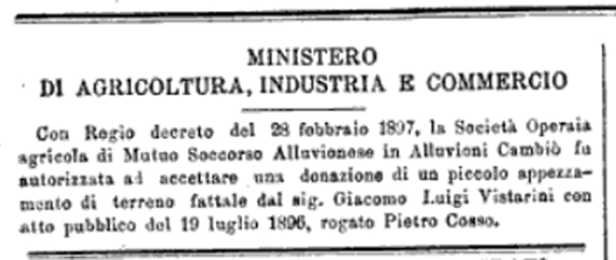- Società Agricola Operaia di Mutuo Soccorso Alluvionese: fondata nel 1886 e riconosciuta giuridicamente nel febbraio 1894. Sciolta durante il fascismo, la Società è stata ricostituita nel dopoguerra, pur senza avere uno stato giuridico regolare. Il nuovo Statuto e gli organi amministrativi sono stati depositati presso il Tribunale di Alessandria e legalmente riconosciuti nel 1983.