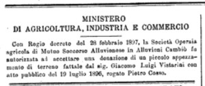 - Società di Mutuo Soccorso fra Operai ed Agricoltori: fondata nel 1894.