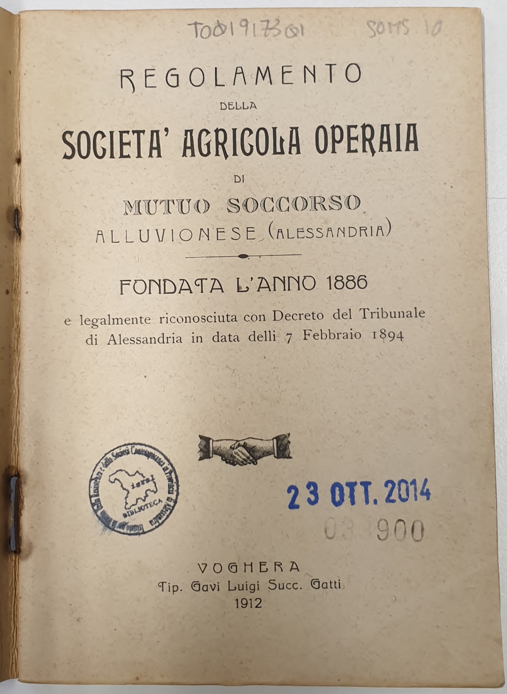 1912: Libretto del Socio con Regolamento della S.O.A.M.S. Alluvionese (da fondo S.O.M.S., ISRAL Alessandria).