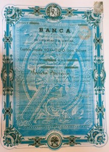 1878 (?): Certificato Azionario della Banca dei Piccoli Prestiti e Cassa di Risparmio del Circondario di Tortona alla Società Operaia.