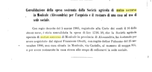 1905: “Bollettino ufficiale del ministero d’agricoltura, industria e commercio”, convalida dell’acquisto e del restauro di un edificio da utilizzare come sede sociale da parte della Società agricola operaia di Mutuo Soccorso.