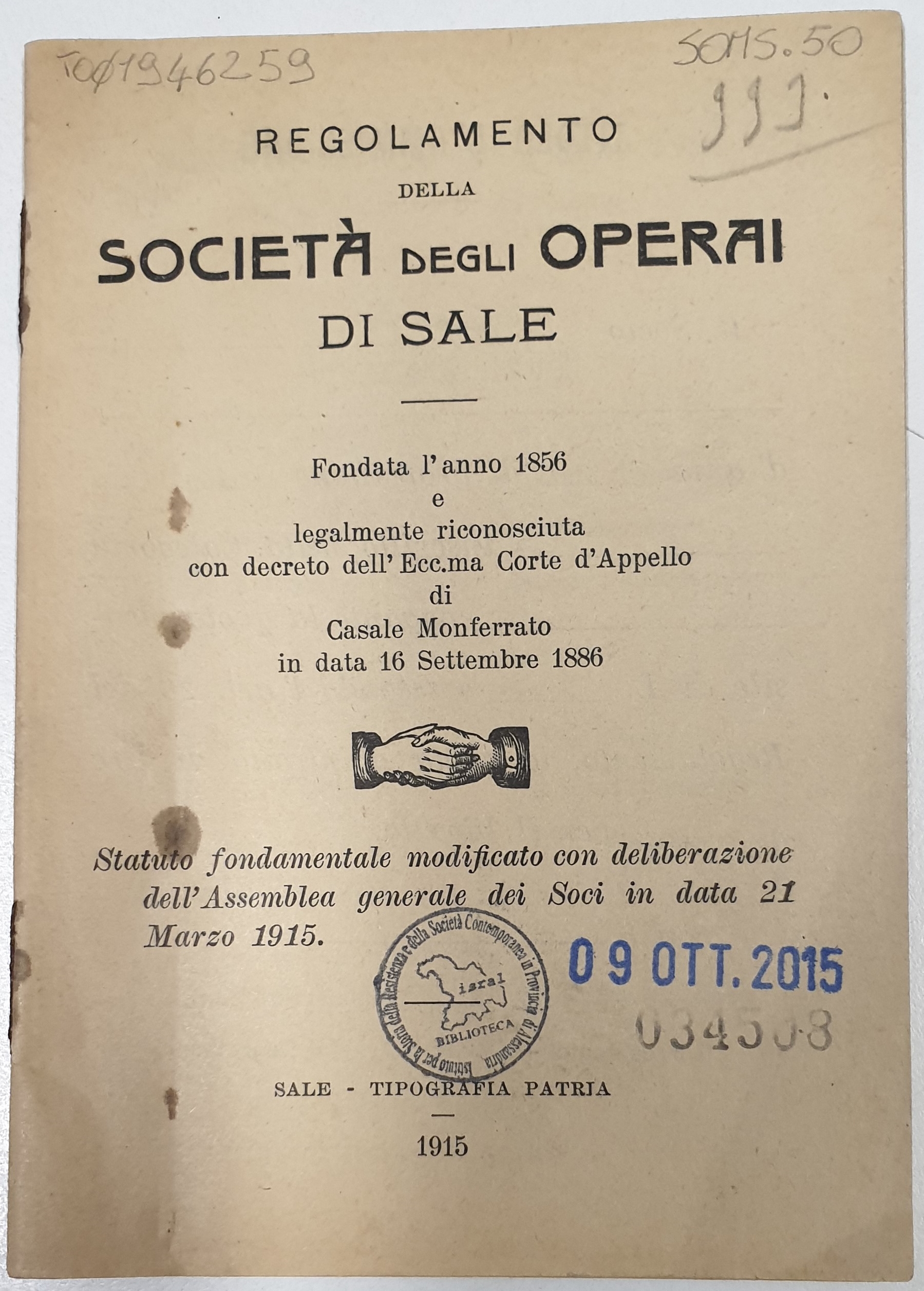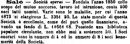 Flavio Peloso, in una nota al suo contributo in San Luigi Orione: da Tortona al mondo. Atti del convegno di studi. Tortona 16-16 marzo 2003 indica anche la presenza di una Società Cattolica a partire dal 1887. - Dalla documentazione della Società di Mutuo Soccorso ed Istruzione di Tortona, risulta che, già alcuni anni prima del 1860, una Società di Mutuo Soccorso era stata istituita a Sale, come “Società figliale” del sodalizio tortonese.