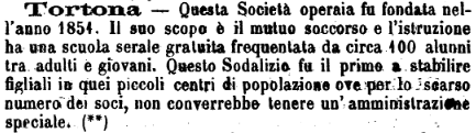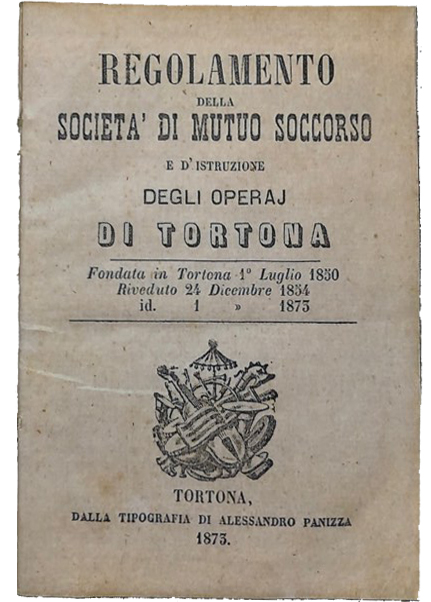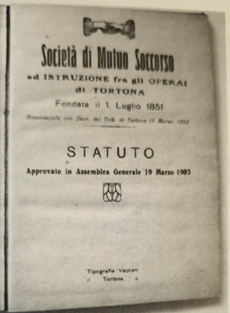 - Società Operaia di Mutuo Soccorso ed Istruzione: fondata nel luglio 1851 ma, di fatto, già operativa nello stesso mese dell’anno precedente (da notare la differenza nelle date di fondazione riportate, nelle immagini più sotto, relative allo Statuto e del Regolamento). E’ una delle più antiche Società di Mutuo Soccorso ancora attive in Italia. Il sodalizio muove i primi passi nel settembre 1850 e, nell’ottobre di quell’anno, risulta tra i promotori di un’aggregazione temporanea delle “Società di Mutuo Soccorso già costituite e di quelle che dovevano costituirsi nello Stato Sardo”. In realtà, l’adesione e la condivisione dell’accordo risulta controversa: stando a quanto riportato nella corrispondenza tra il presidente Franchini e la Società di Torino, pare che il rappresentante della Società di Novi Ligure, presente ad un precedente incontro anche per nome del sodalizio tortonese, avesse ecceduto nei termini del suo mandato e avesse autonomamente confermato il parere positivo dei colleghi tortonesi su tutti gli articoli.