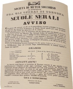 Fin dal 1853, l’istruzione è una tra le attività più importanti del sodalizio tortonese che, fino al 1932, rimane uno dei pilastri dello sviluppo culturale ed educativo della città: corsi di alfabetizzazione per adulti con oltre 700 partecipanti; i corsi professionali; la scuola di disegno; la scuola elementare che, nel 1869-70, arriva ad avere fino a 245 iscritti.