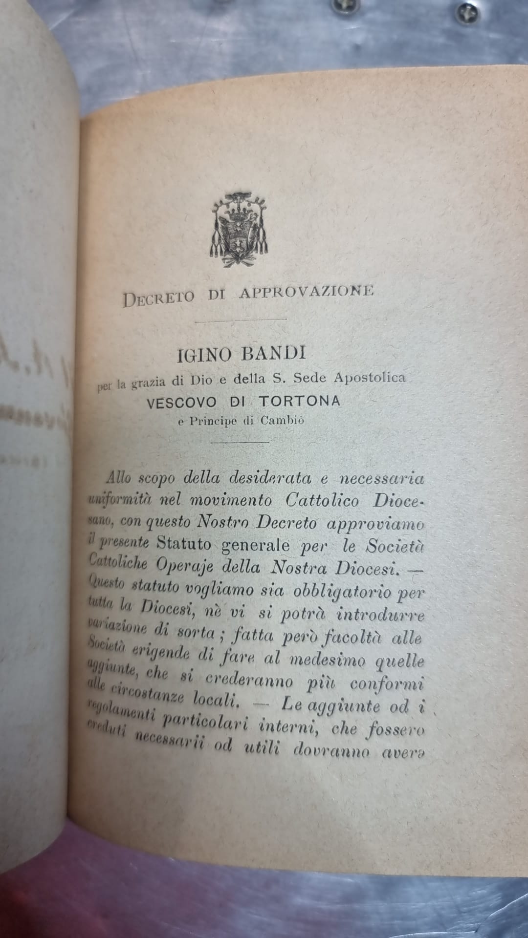 Successivamente alle modifiche apportate alla legge 3818/1186, la Società si è iscritta nella sezione delle Imprese sociali della Camera di Commercio di Alessandria. - Società Cattolica di Mutuo Soccorso fra gli Operai “S. Marziano”: fondata nel 1884, durante l’episcopato di Mons. Capelli, è forse la prima Società Cattolica Operaia in Italia, nata sette anni prima della promulgazione della Rerum Novarum di Papa Leone XIII. La sua opera, favorita dall’ispirazione e dell’attivismo di personalità come quella del Vescovo di Tortona, Mons. Igino Bandi, è stata particolarmente significativa. Nel 1895, Mons. Bandi scrive: “Sarebbe nostro desiderio che in tutte le borgate e i villaggi più popolati di questa nostra dilettissima diocesi sorgessero e fossero istituite società operaie cattoliche.” Due anni dopo, redige e pubblica lo Statuto per le Società Operaie Cattoliche della Diocesi di Tortona. Alla fine dello stesso anno, la Società inaugura una nuova cooperativa di consumo. Tra i soci immaginiamo più attivi della “San Marziano” da ricordare l’allora chierico Luigi Orione.