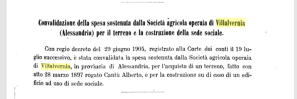 1905: “Bollettino ufficiale del Ministero d’agricoltura, industria e commercio”, convalida dell’acquisto di un terreno da parte della Società Agricola Operaia di Villalvernia per l’edificazione della sede sociale.