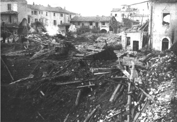 1° dicembre 1944: Villalvernia dopo il bombardamento alleato che distrusse gran parte del paese e la sede della Società Agricola Operaia.