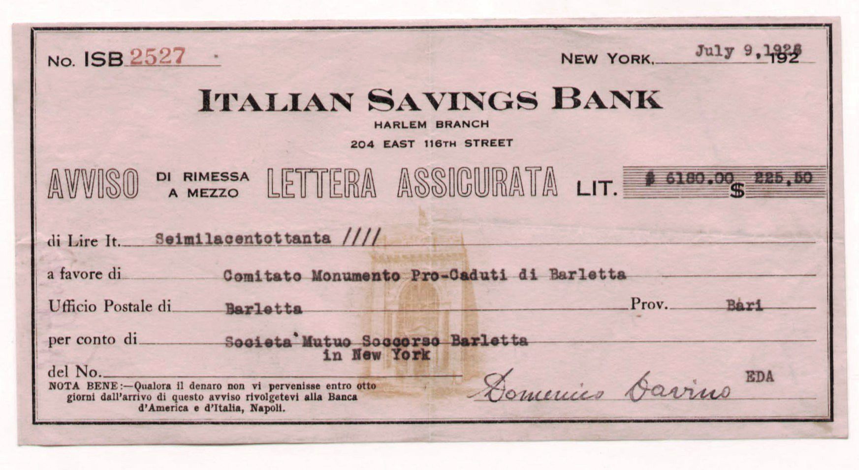 1926 – Versamento da parte della Società di Mutuo Soccorso Barletta di New York a favore del Comitato Monumento pro Caduti di Barletta